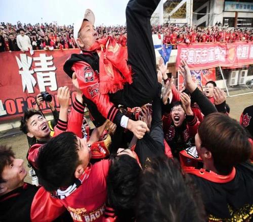 与之形成对比的,是队内的“老足球人”。吴庆成为领队的第一年,他经历过两江竞技解散的悲剧,那天他一个人背着包离开俱乐部的背影,是他留给深爱的职业足球最难过的画面。上赛季,吴庆临危受命出任代理教练,又经历了冲超失败的苦涩。在年轻人疯狂庆祝的瞬间,他眼里闪着泪花,没有太多的言语表达,只是默默地看着身边的弟弟们,甚至是孩子们,铜梁龙之于他,已经超出了“阵地”的意义,更有他足球生命的延续。