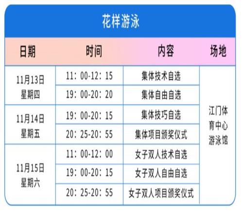 本次花样游泳项目分为集体、女子双人两个小项。其中,集体项目要进行集体技术自选、集体自由自选、集体技巧自选三项较量,三项成绩之和总分最高的队伍将获得金牌,最后一项集体技巧自选将于11月14日19:00进行,结束后产生本届全运会花样游泳集体项目金牌。