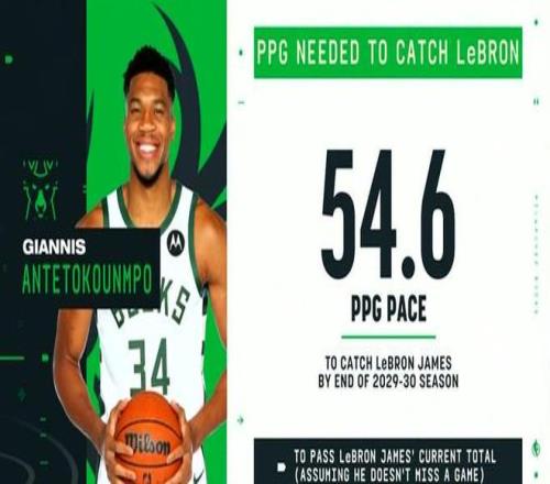 截至目前,NBA的总得分王是詹姆斯,他得到了42250分;而字母哥目前得到了21002分,仅排名第42位。美媒在这一报道后对字母哥的目标进行了计算,假设詹姆斯从现在起不再得分,那么字母哥需要在未来全勤的情况下做到场均54.6分,便能在2029-30赛季的时候超过詹姆斯成为NBA总得分王。