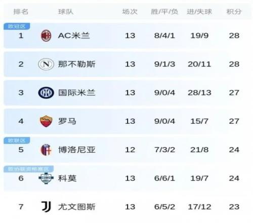 意甲第13轮,罗马0-1不敌那不勒斯,让出榜首。米兰与那不勒斯同分分列前二,罗马输球后从第一掉至第四,国米升第三。