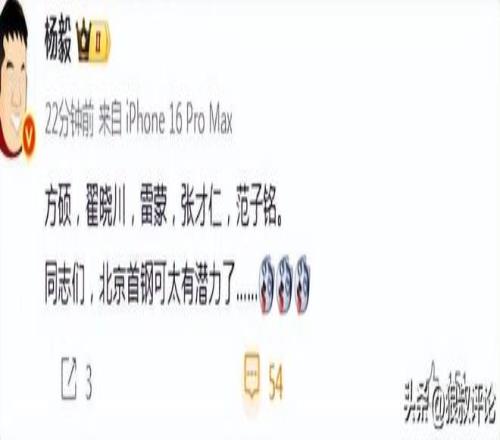 媒体人“海jun的蓝”发文点评:“看看今天北京队参加潜力赛的球员,35岁的方硕,32岁的翟晓川,30岁的雷蒙,30岁的张才仁以及27岁的范子铭,平均年龄将近31岁,真的太有潜力了!