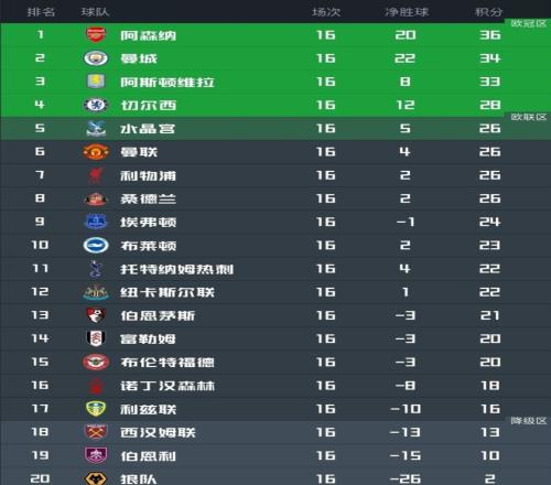 本轮战罢,领头羊阿森纳仍领跑。但身后的曼城和维拉给他们施加了巨大压力,在不断连胜后,两队距离阿森纳分别只有2分和3分。