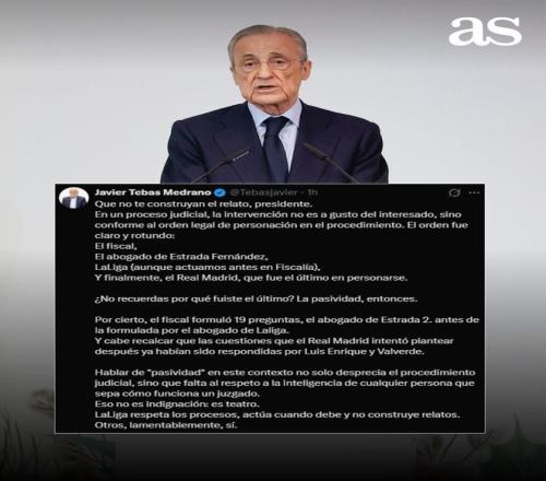 “主席先生,别让别人给你编故事了。在司法程序中,参与顺序并非由当事人意愿决定,而是遵循法律规定——这个顺序明确且不容置喙:首先是检察官,接着是埃斯特拉达-费尔南德斯(小编注:前裁判,2023年2月,埃斯特拉达就“内格雷拉案”向法院提起刑事诉讼。)的律师,之后是西甲联盟(尽管我们在检察院之前就已采取行动),最后才是皇家马德里,你们是最后一个参与的。”
