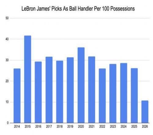从追踪时代开始到上赛季,存在一些年度间的波动,但大体上在那段时间内保持了惊人的一致性。尤其是考虑到詹姆斯在那段时间里从29岁成长到了40岁。但随后到了2025-26赛季,出现了骤降。