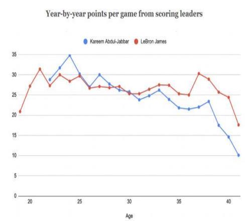 对于NBA历史上几乎所有其他球员来说,能打到40岁本身就是一项非凡的成就。场均得到17.6分更是前所未有。此前在这个年龄的得分领先者是贾巴尔,他在41岁赛季场均得到10.1分,那是在漫长、渐进的衰老曲线末端。他最后一个场均至少24分的赛季是在33岁。