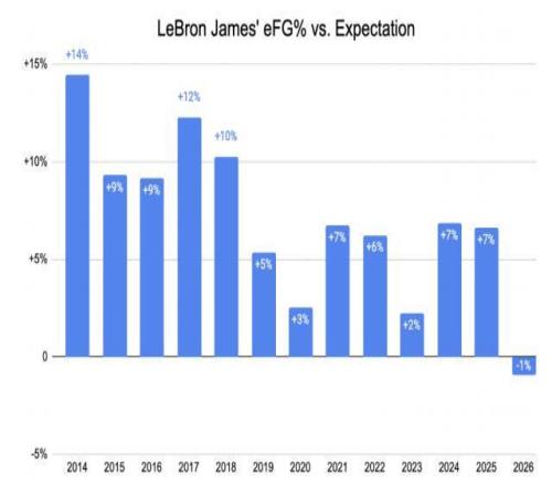 然而在2025-26赛季,詹姆斯有记录以来首次略微低于其投篮质量预期的效率值。