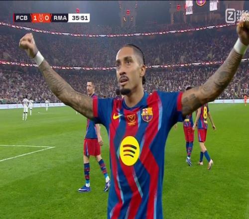 西班牙超级杯决赛,巴塞罗那对阵皇家马德里,上半场拉菲尼亚破门为巴萨取得领先,至此,拉菲尼亚12次对阵皇马已打入6球,比他巴萨生涯对阵其他对手都要多。