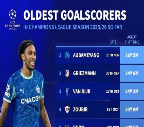 北京时间11月26日,在欧冠联赛阶段第5轮的比赛中,奥巴梅扬完成梅开二度,帮助马赛主场2-1逆转战胜纽卡斯尔联,赛后德转列出本赛季欧冠最年长的10位进球球员,奥巴梅扬以36岁5个月的