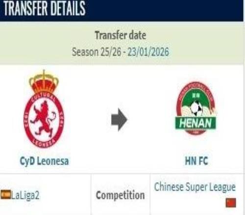 德转:西乙莱昂文体边锋姆布拉加盟河南队的转会费为20万欧